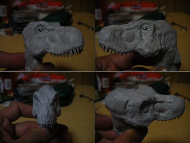 全体にポリパテが食いつかないようにメンタムを塗って、ポリパテを盛って、くるくるまわせばあら不思議、ティラノヘッドのチェス風台座ができましたーーーー